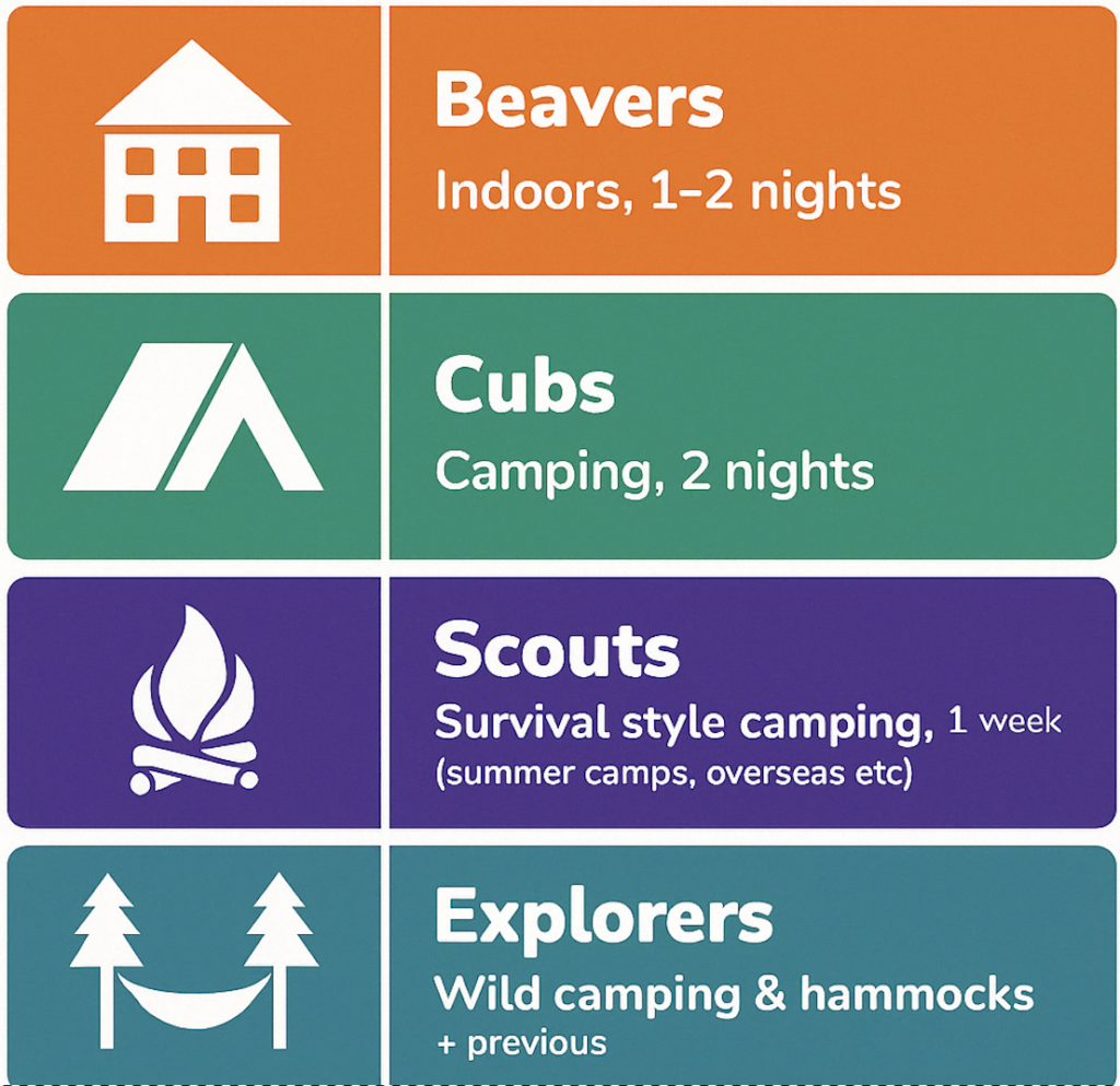As a leader, have you considered working towards gaining a night away permit to run an overnight event or camp? We are always in need of more volunteers across the group, so please get in touch with James who can pair you up with someone in the group who already holds a Nights Away Permit as it is a very rewarding experience that also serves as the foundation of Scouting – getting outside and camping. Here are some guidelines we should follow as a group to keep overnight and camping fun as young people as they move between sections: