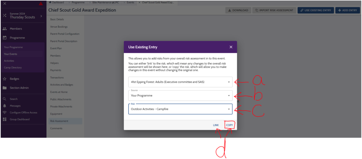 - LINK: This means that you cannot amend the risk assessment within your activity – it must be amended within the adults section/wherever it was linked from. Any changes here will automatically reflect on your activity so this risk assessment will not necessarily be the same some years down the line.